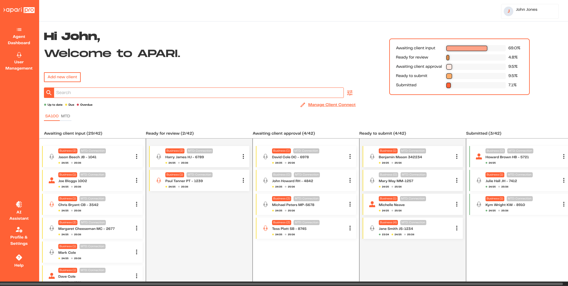 Your agent dashboard appears when you log in. From here, you have an overview of all clients and their status in the personal tax workflow.