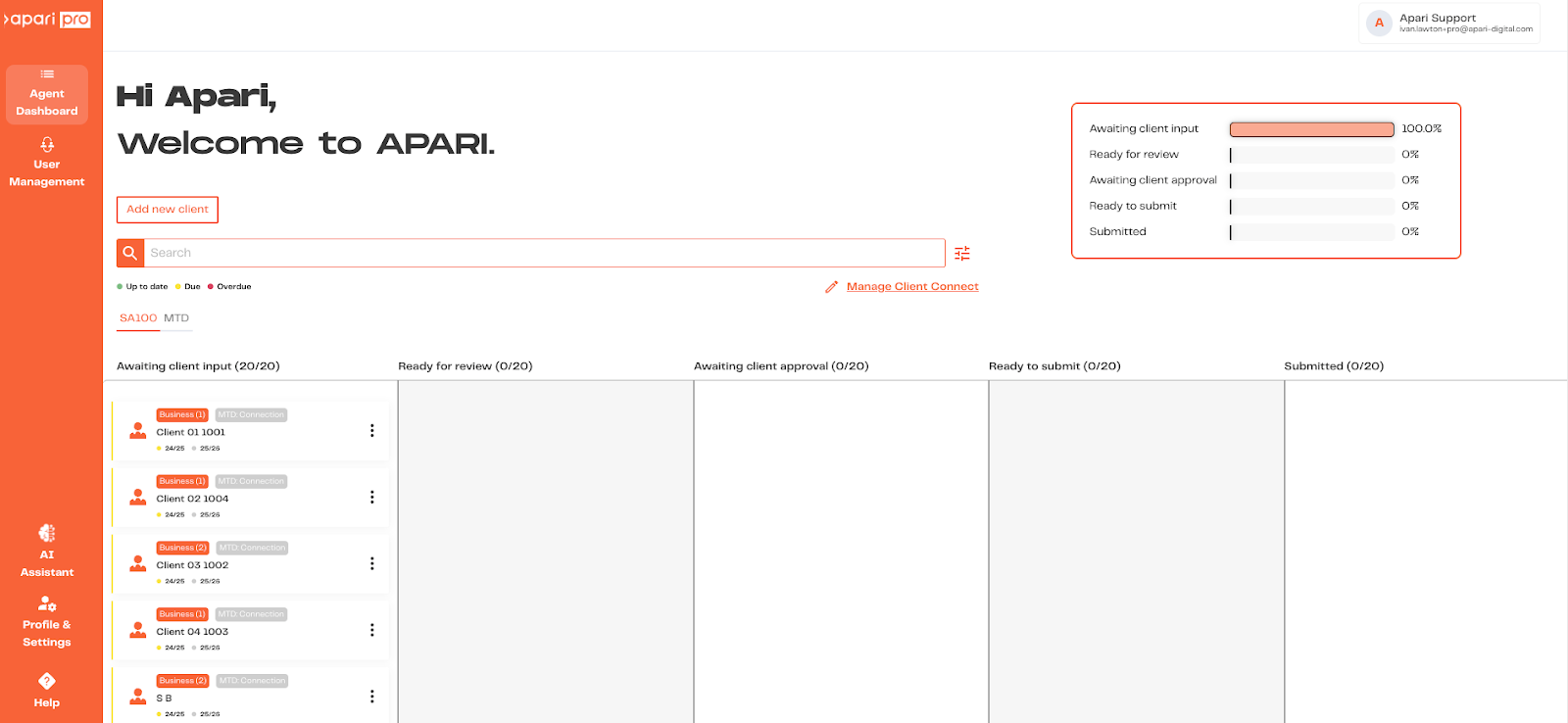 In the first instance, please make sure you are logged into ApariPro and you are on the Agent Dashboard display. Before using the document analyser tool, please make sure all business sources for the client you wish to import documents for have been created in the client’s account.