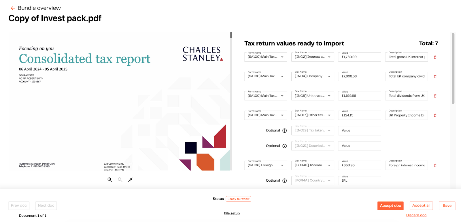 You will be taken through each document individually where you will have a preview of the document on the left hand side and the AI’s output on the right hand side. If you are using a smaller screen, the view may be stacked top to bottom. Here you will be able to review and edit the information as needed. Once you have done so you can click on Accept Doc if you are happy as it is, or Save if you need to come back to it at a later stage.