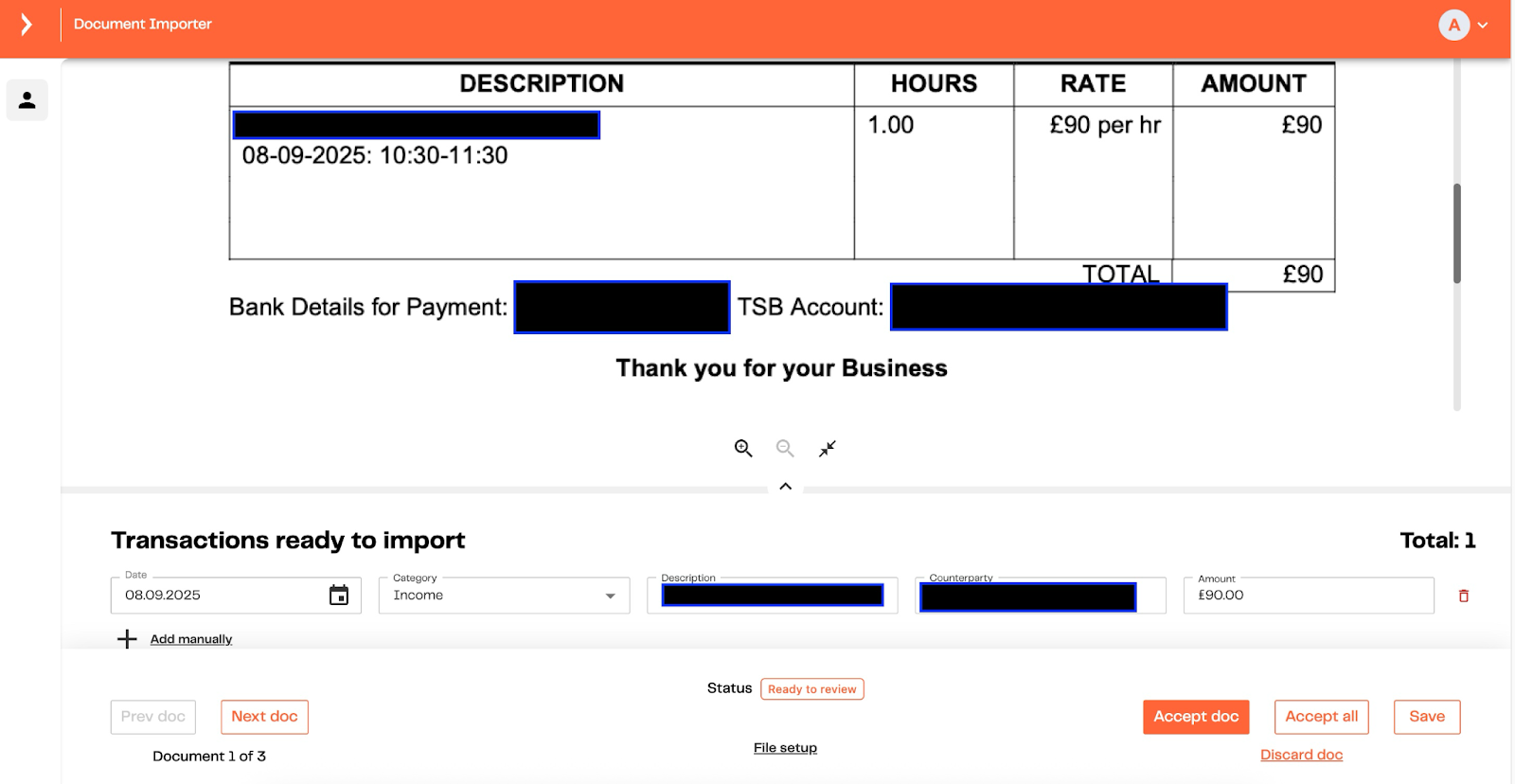 You will be taken through each document individually where you will have a preview of the document as well as the output found at the bottom of the page. Here you will be able to review and edit the information as needed. Once you have done so you can click on Accept Doc if you are happy as it is, or Save if you need to come back to it at a later stage.