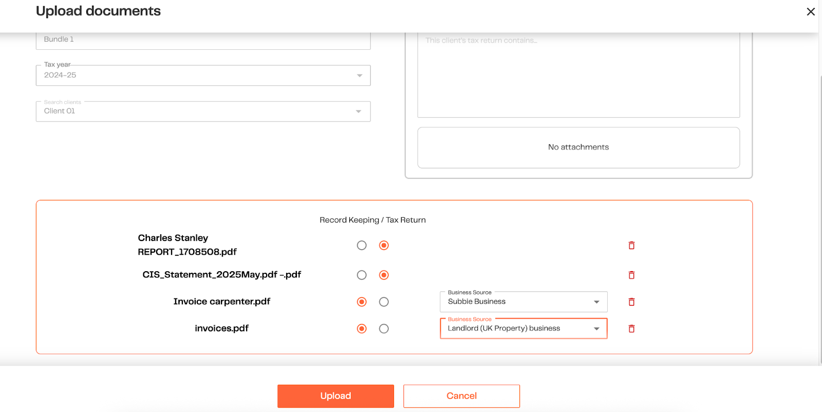 Before uploading the documents, you will need to indicate if the source document needs to go through our Record Keeping functionality or direct input on the tax return.