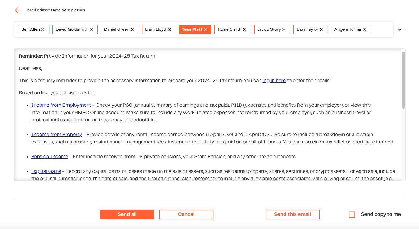 Send this during return preparation when you need specific information from clients. The email automatically personalises based on their profile: