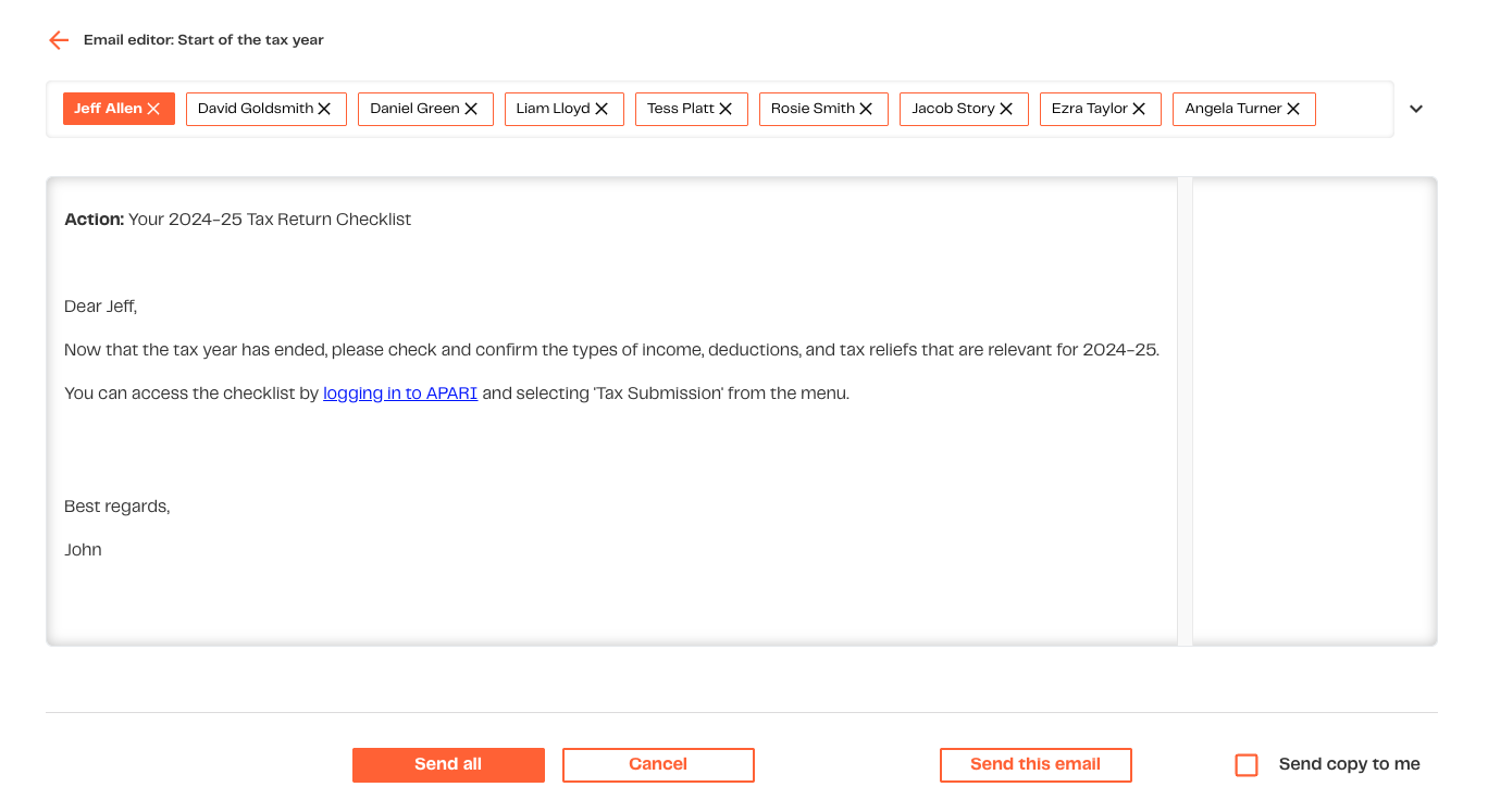 The Email Communication Tool allows you to send templated emails to multiple clients at key points in the tax year. Rather than composing individual emails, you select your clients and the tool sends personalised versions based on each client's tax profile.