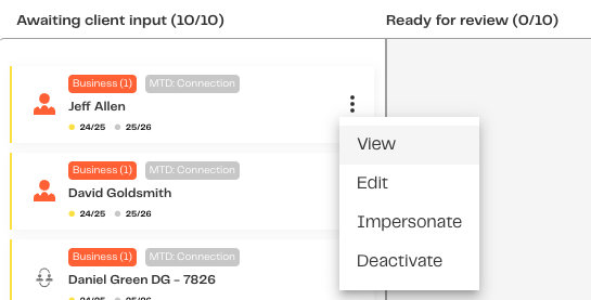 The three-dot menu is your main tool for managing client records. Get comfortable with clicking it next to each client to see your options: View, Edit, Impersonate, and Deactivate.