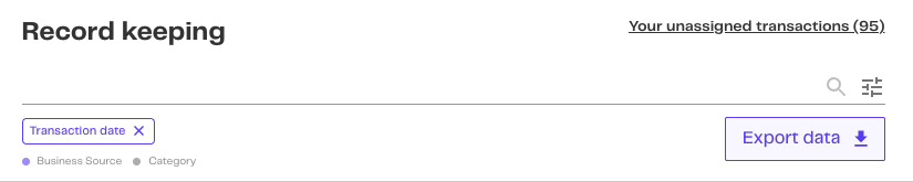 You can export the reviewed transaction data by selecting the Record Keeping Section and selecting ‘Export Data’ under reviewed transactions. You can use the search bar or filter button if you wish to create an export of certain transactions like expenses or by date period, when the desired filters have been set select Export Data.
