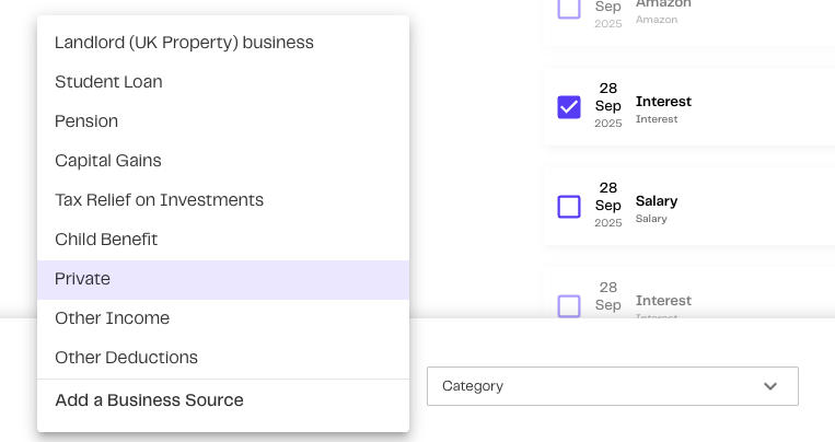 Choose Business Source & Category: From the dropdown menus in the bottom right corner, select the appropriate Business Source and Category for the transaction(s). Select ‘Apply’ to confirm and assign the transactions.
