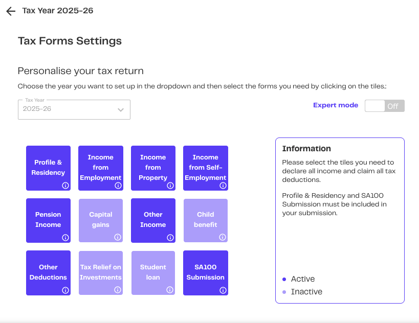 If you need more than our standard SA100 tiles for your client, switch to expert mode. This will allow you to add the additional full supplementary pages to your clients tax return. Once enabled expert mode cannot be changed back to standard mode. To enable expert mode select the ‘Tax Submission’ section and and then the purple tiles and cog, select the correct tax year from the drop down menu and change the slider on expert mode to on and select confirm then save. When you return to the tax submission the view will be updated to the full supplementary pages.